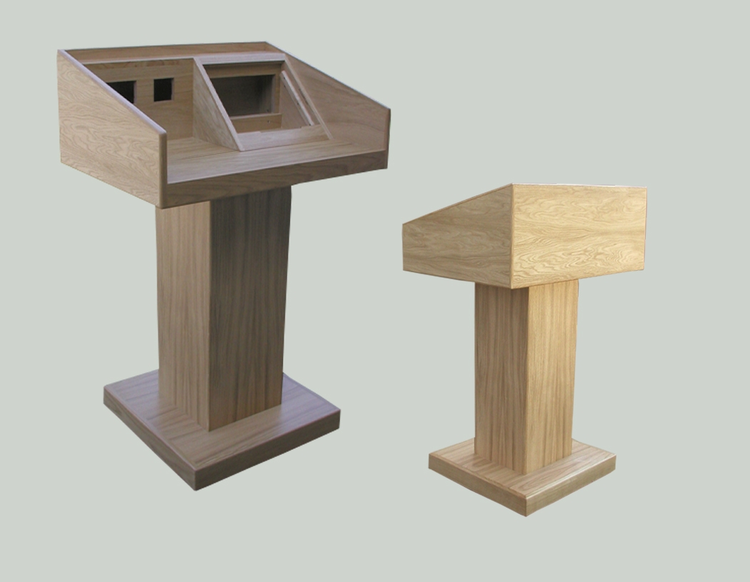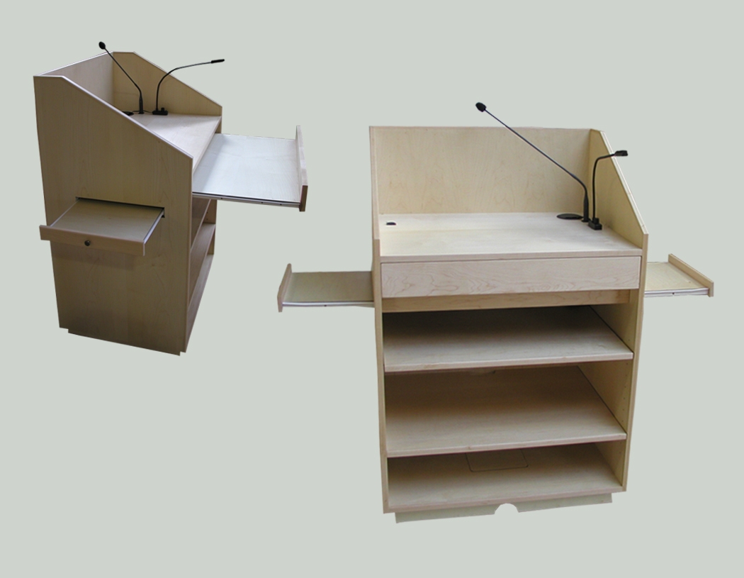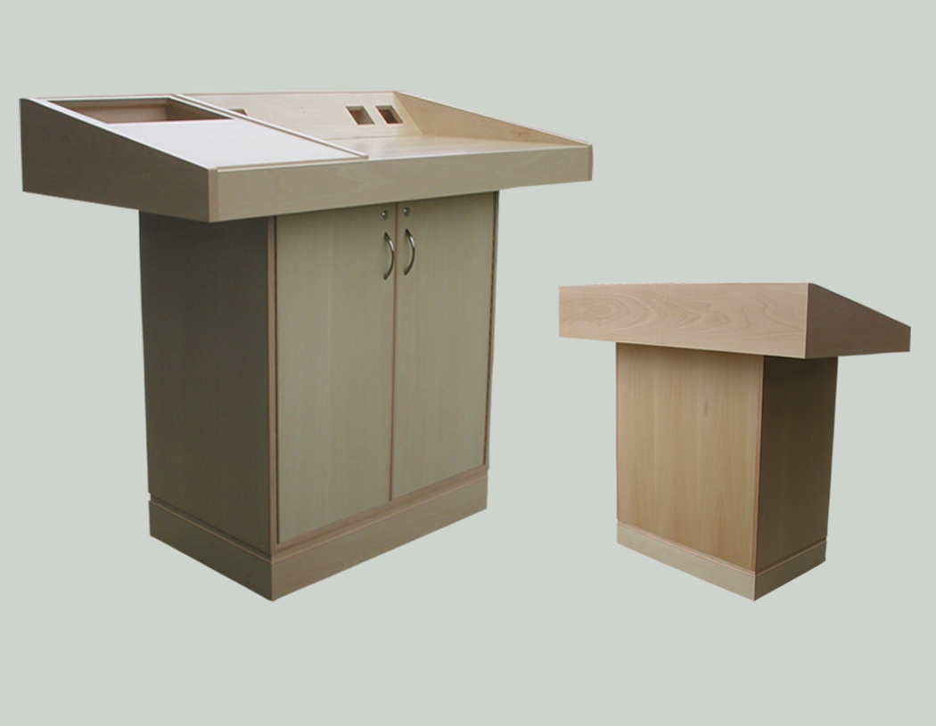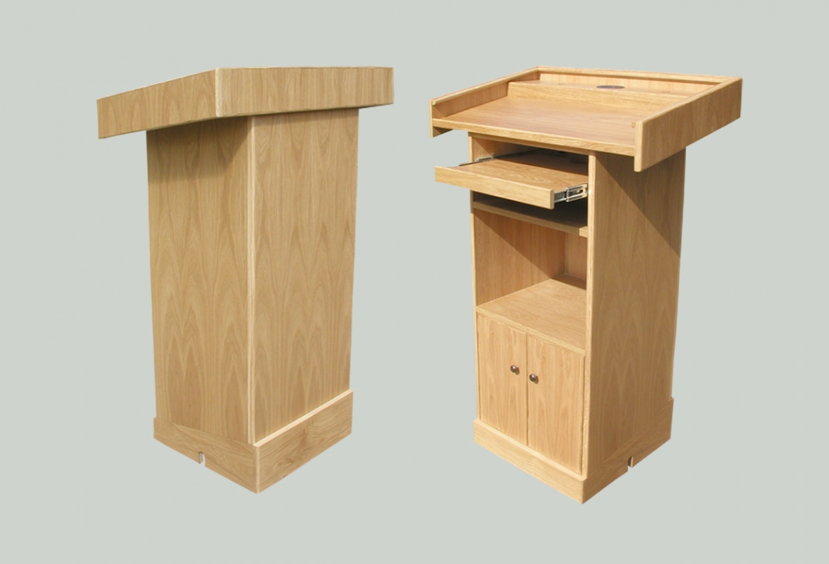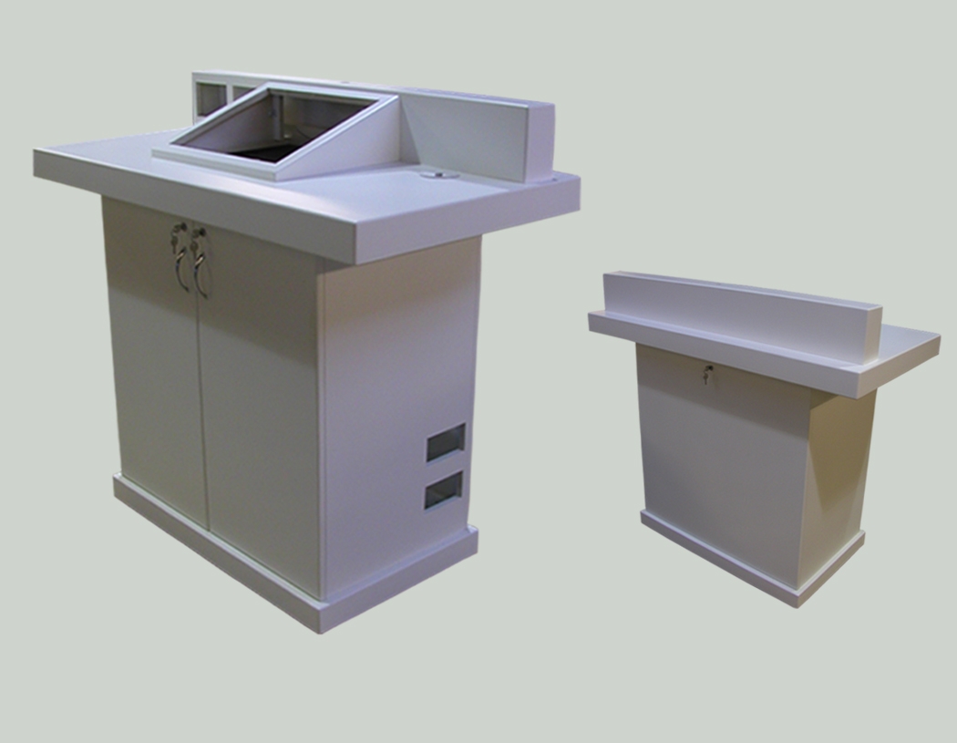 Presentation lecterns and podiums are designed to complement the specific location and the technical requirements of the installation. This often involves fitting microphones, equipment racks and touch screens within the lecterns. The ability to have the script surface rise and fall can be incorporated by the installation of an electric lift.