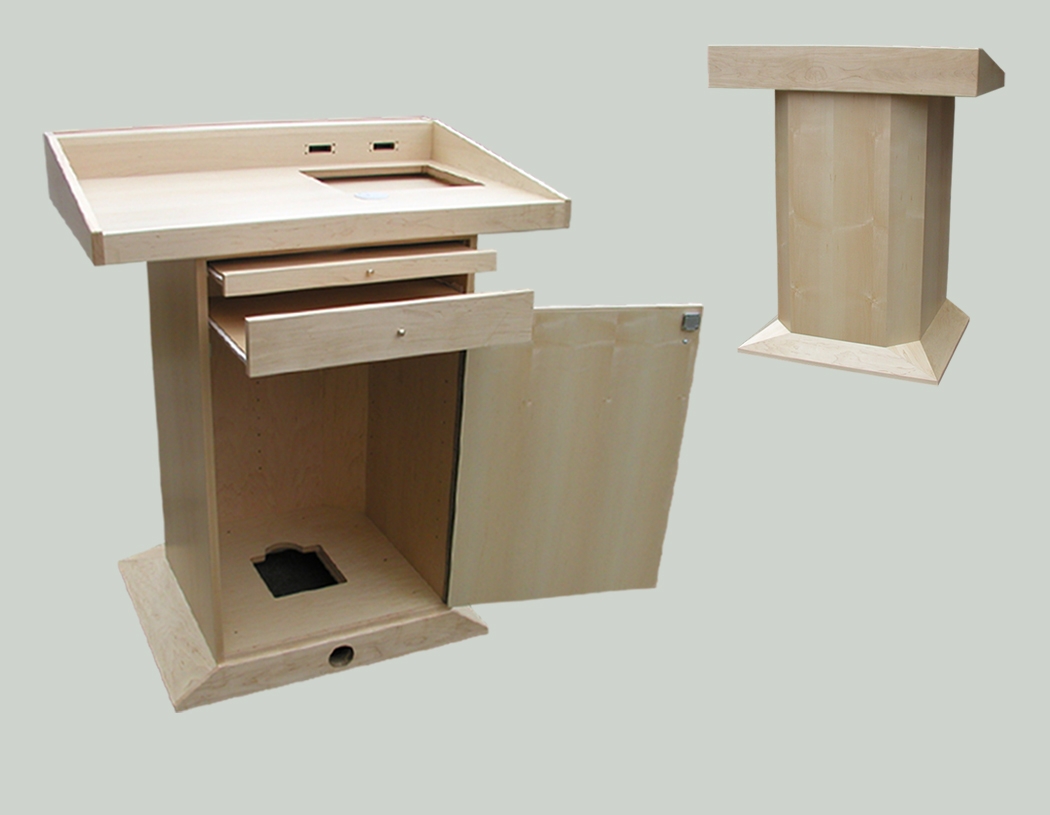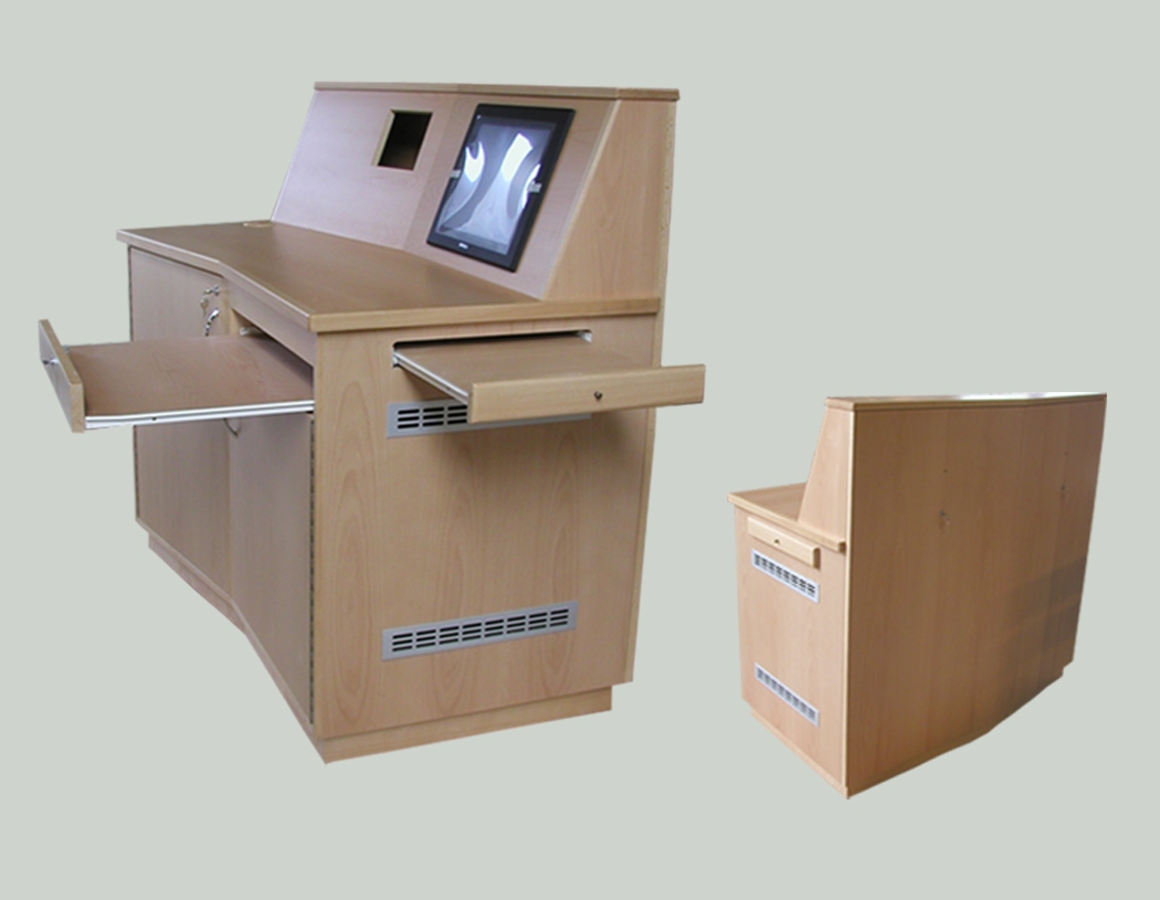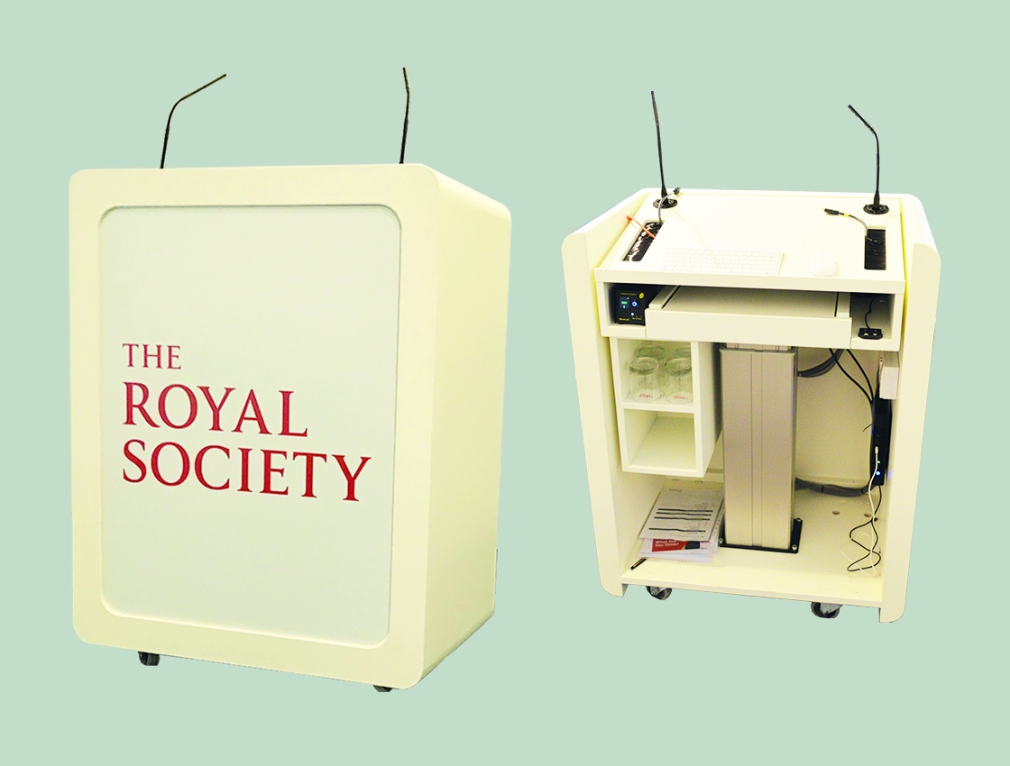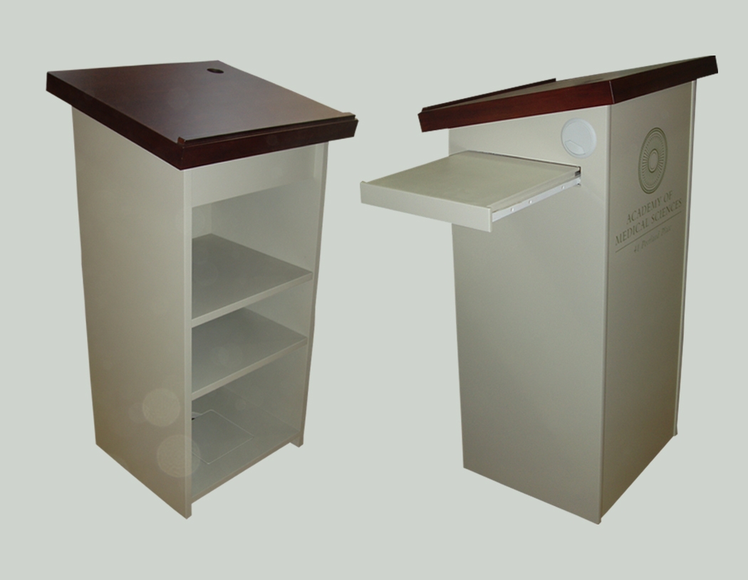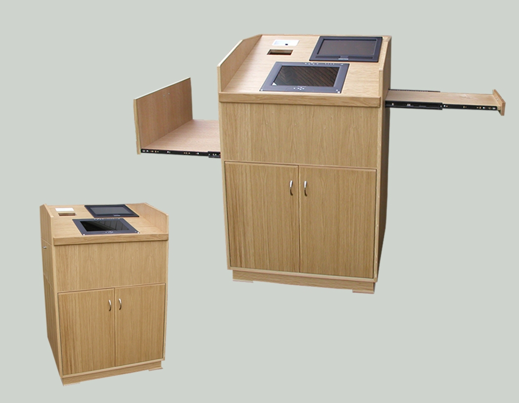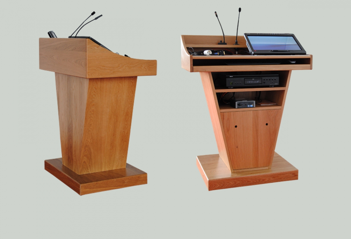 Presentation lecterns and podiums are designed to complement the specific location and the technical requirements of the installation. This often involves fitting microphones, equipment racks and touch screens within the lecterns. The ability to have the script surface rise and fall can be incorporated by the installation of an electric lift.