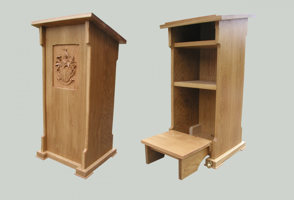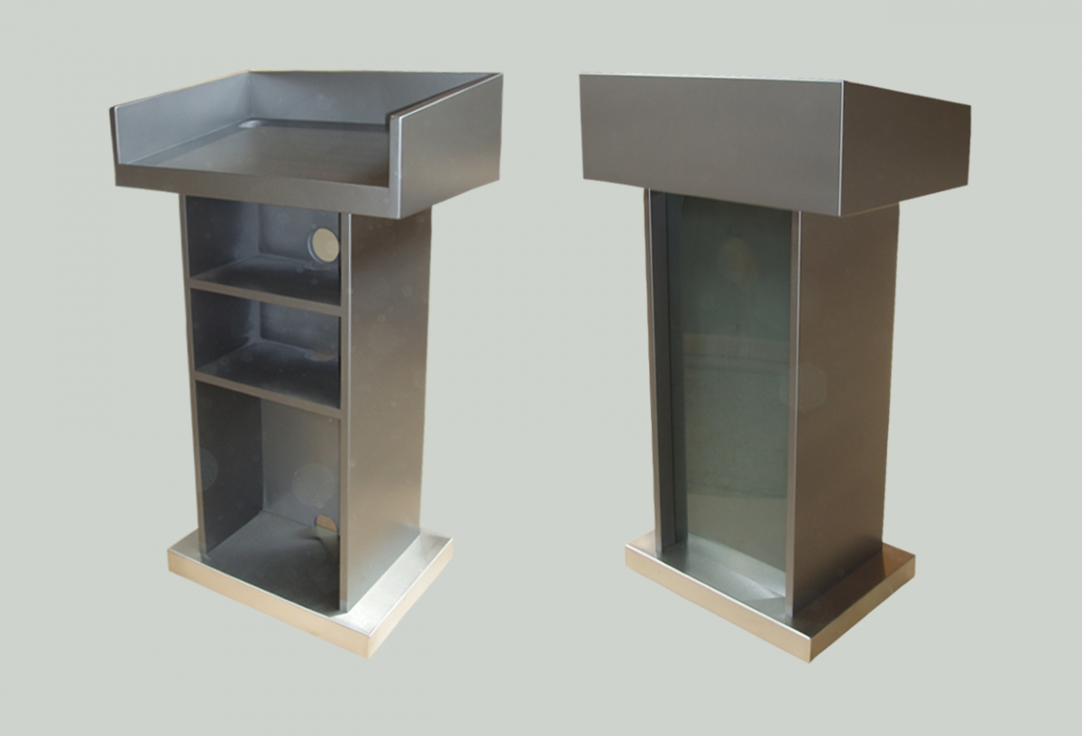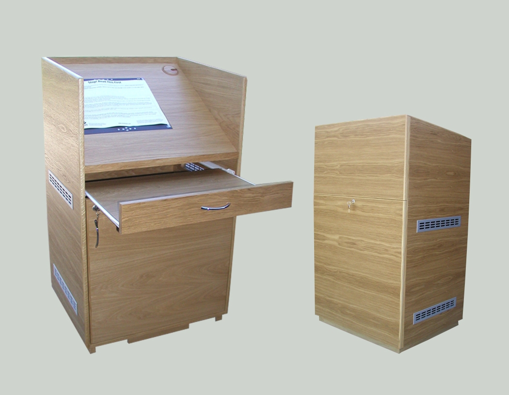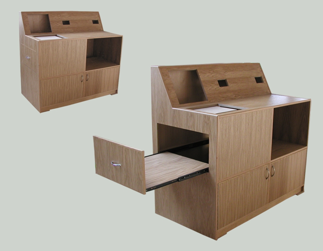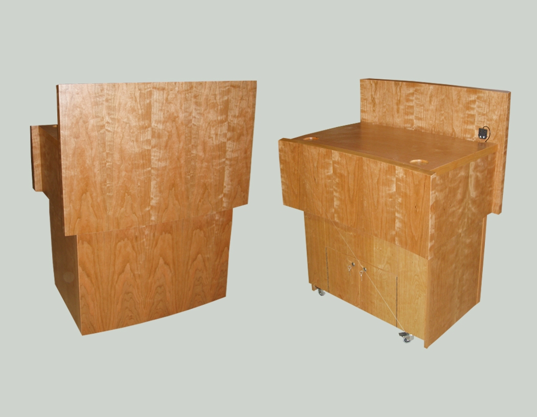 Presentation lecterns and podiums are designed to complement the specific location and the technical requirements of the installation. This often involves fitting microphones, equipment racks and touch screens within the lecterns. The ability to have the script surface rise and fall can be incorporated by the installation of an electric lift.